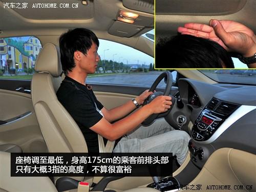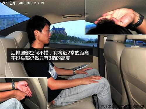 圖中的體驗著身高175cm左右,在調(diào)整好合適的坐姿之后,前排頭部只有三指,而后排也僅僅3指,所以這點證明了流線型的車身線條還是會給頭部一些小的影響。當(dāng)然,超長的軸距直接帶來了腿部空間的提升,作為小型車來說后排能達(dá)到兩拳的長度確實不多見。