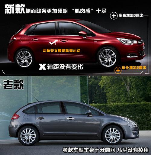 一般意義上來說,區(qū)別一款車型是不是小改款車型主要看是否只是改動了車身前后的造型。而全新的雪鐵龍C4的絕對可以稱得上新車,通過車身側(cè)面的對比我們可以清楚的看到,在C柱部分已經(jīng)進行了重新設(shè)計,而側(cè)面不對稱的交叉腰線在彰顯了個性的同時也提升了整車造型的質(zhì)感。
