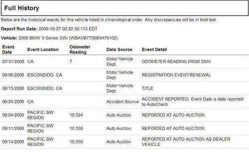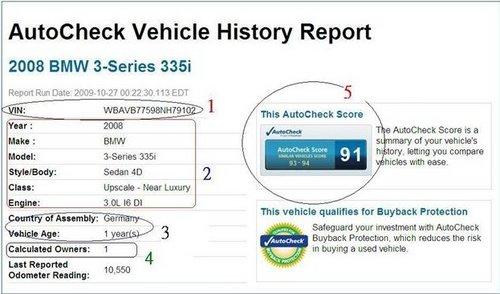 AutoCheck report與美國部份州的監(jiān)理所(DMV)有合作關(guān)系,因此如果您上美國監(jiān)理所(DMV)的網(wǎng)站,監(jiān)理所都會建議您在買車的時候,一定要檢查AutoCheck報告,在AutoCheck報告可能可以提供您買車的重要參考資料-如經(jīng)歷多少任車主,里程數(shù)為何,何時何地掛牌,是否有出過交通事故,車籍資料是否干凈(如Lemon car, Salvage or Junk title),等等歷史資料。另一份也一定要了解的是CarFax。