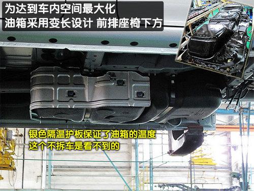 在總裝車間里我們發(fā)現(xiàn)了NV200的油箱,NV200為了更好的是車內(nèi)空間最大話,采用了扁平的油箱設(shè)計,油箱位于前排座椅下。在油箱前側(cè)還發(fā)現(xiàn)了隔溫護板,以保證油箱的溫度。相比這個是不來生產(chǎn)車間是看不到的。