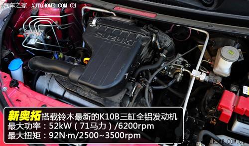 新奧拓搭載了鈴木最新開發(fā)的K10B全鋁發(fā)動機,最大功率71Ps/6200rpm,最大扭矩92N·m/2500-3500rpm,低轉速區(qū)間即可輸出較高的扭矩,發(fā)動機調教很適合城市駕駛,發(fā)動機采用正時鏈條傳動,終身免更換;另外這款發(fā)動機的燃油經濟性非常出色。