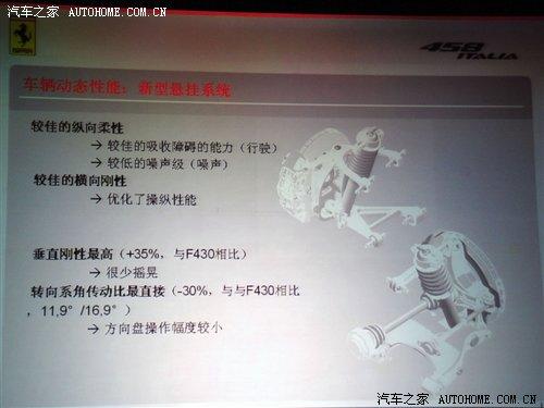 該車(chē)采用的新型底盤(pán)亦為鋁制,在底盤(pán)設(shè)計(jì)過(guò)程中,馬拉內(nèi)羅的工程師不僅運(yùn)用了各類(lèi)先進(jìn)的合金材料,同時(shí)也從航空航天業(yè)借鑒了尖端的制造和焊接技術(shù)。在車(chē)輛動(dòng)力方面,法拉利458 Italia的懸掛系統(tǒng)在前部配備了雙叉骨,而后部則采用了多鏈系統(tǒng),借以提供最大的附著力和無(wú)與倫比的操控性能。該車(chē)的轉(zhuǎn)向傳動(dòng)比更加快捷高效,在實(shí)現(xiàn)極速入彎的同時(shí)也能保證超凡的駕駛舒適度。