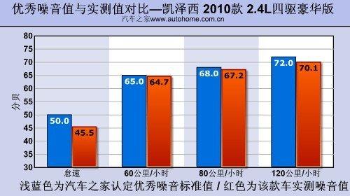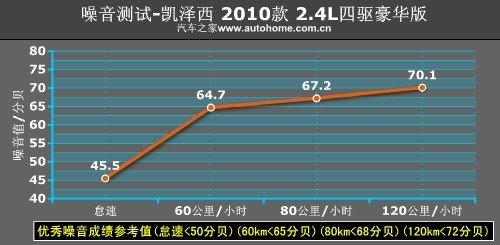 在一條平直無(wú)車的高速公路上,我們測(cè)得凱澤西的噪音值為:怠速45.5分貝;60公里/小時(shí)64.7分貝;80公里/小時(shí)67.2分貝;120公里/小時(shí)70.1分貝。這樣的水平在同級(jí)別中算是比較安靜的,完全不輸于那些以舒適性見長(zhǎng)的車型。
