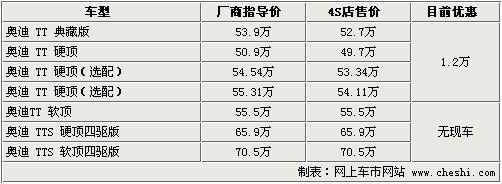 據(jù)4S店銷售人員介紹:目前奧迪TT已上市的典藏版車型店 內(nèi)有現(xiàn)車,售價(jià)為53.9萬元,TT標(biāo)準(zhǔn)版車型有現(xiàn)車,售50.9萬元,但還有2款在50.9萬元基本款車型上增配車型,分別售54.54萬及55.31 萬,以上這4款車型都可優(yōu)惠1.2萬元,車身顏色共有白色、紅色、銀色及日光橙色供挑選。奧迪TT典藏版相對(duì)在售TT車型不同的是,這款車配以橘色車身及 運(yùn)動(dòng)套件,車內(nèi)車外都進(jìn)行運(yùn)動(dòng)改裝,看起來十分漂亮。如需預(yù)定TT及TTS其他顏色及車款,需等待4-6個(gè)月時(shí)間,由于是按照車主需求定制車型,所以等待時(shí)間較長(zhǎng)。