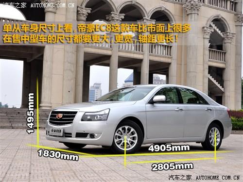 車身尺寸早就成為中國人選擇中型車的一個重要參考指標,而帝豪EC8車型的車身尺寸為長*寬*高:4905mm*1830mm*1495mm,其中車身長度為4905mm,這樣的尺寸在國內(nèi)在售的中型車中是相對較大的,另外2805mm的軸距也是一個相當有誘惑力的數(shù)字。同級車中最長的車身與長軸距就為這款車在內(nèi)部空間上上帶來了相對富足的空間,究竟內(nèi)部空間怎樣我們下面會詳細說。