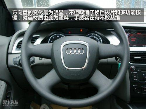 內飾中方向盤的變化最為惹眼,在取消了換擋撥片以及方向盤多功能按鈕之后,A4L政府公務版的方向盤讓人覺得光禿禿的,有戲不習慣。另外方向盤不再是真皮包裹,而改為了手感較軟的一體式塑料方向盤。雖然塑料的材質已經算得上優(yōu)異,但手感相比真皮還是有些不敢恭維。
