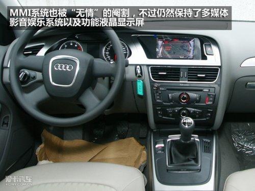MMI多媒體影音導航系統(tǒng)也被閹割,排擋桿后面空空的塑料飾板顯得有一點點刺眼。不過音響系統(tǒng)與更高版本相比并無變化,而自動空調則取消了雙溫區(qū)劃分功能。不過無論是面板材質還是整體制造工藝,完全保留了奧迪嚴謹豪華的風格,質感強烈的同時裝配嚴絲合縫,旋鈕的阻尼力度也十分適中。