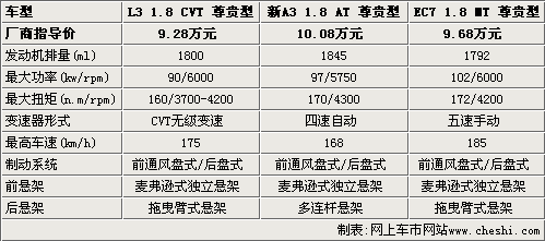 帝豪EC7的最大功率高于其他兩款車型,并且配備了五速手動(dòng)變速箱,能擁有185km/h的最高車速是比較正常的。相對而言,奇瑞A3的動(dòng)力優(yōu)勢并不明顯,再配備四速自動(dòng)變速箱,動(dòng)力和經(jīng)濟(jì)性也明顯不如其他兩款車型。比亞迪L3的發(fā)動(dòng)機(jī)雖然功率比較小,但CVT無級變速箱給這款車加分不少,而且通風(fēng)盤式制動(dòng)也不遜于其他產(chǎn)品。