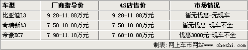 比亞迪L3、奇瑞新A3、帝豪EC7市場(chǎng)行情