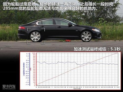 當(dāng)進(jìn)行加速測試時,按慣例我們會阻止所有電子系統(tǒng)介入,將轉(zhuǎn)速維持在發(fā)動機(jī)最佳發(fā)力區(qū),在起步的瞬間使輪胎處于滑與不滑的臨界點(diǎn),之后全力沖刺。不過很抱歉,經(jīng)過多次嘗試,我們無法令XFR獲得最佳的起跑狀態(tài),原因就是因?yàn)檩喬ミ^度磨損,起步的轉(zhuǎn)速一再下降,而順利起步之后很長一段時間,285mm寬的后輪胎都無法與地面保持良好的抓地力。通過加速曲線圖也可以看出,起步后接近1秒的時間,加速度都不高,有時還處于下降狀態(tài),最終5.1秒的加速成績并不是XFR的最強(qiáng)能力。