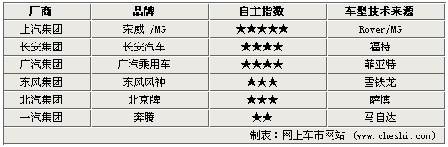 從上表可以看出,坐擁大眾和通用兩個合資品牌的上汽,無疑是自主之路走得最好的,在買斷ROVER先期打造了榮威750、550等車型,而后續(xù)推出的則是全新技術(shù)的車款比如350。而廣汽作為新的加入者,近日下線了傳祺新車,雖然新車源自菲亞特旗下的阿爾法羅密歐,但還是進行了不少改進,并沒有完全照搬過來。而獲得兩星的一汽集團,其奔騰系列車型B50、B70依然是來源馬自達(dá)6,經(jīng)過了這么年的發(fā)展,僅僅是換個外觀就宣稱自主研發(fā)是很難讓人接受的,一汽集團還需努力捍衛(wèi)老大的地位。