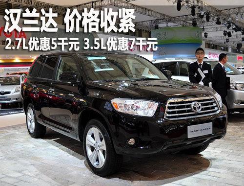 廣汽豐田生產(chǎn)的漢蘭達(dá)Highlander于2009年5月25日正式下線,擁有2.7L和3.5L兩個排量共10款車型,價格區(qū)間為24.88~42.98萬元。近期,編輯從北京廣汽豐田4S專營店獲悉,漢蘭達(dá)現(xiàn)車充足,優(yōu)惠幅度有所縮水,現(xiàn)金讓利最高7千元。詳情見下表: