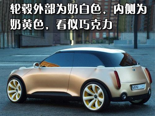 MINI Core概念車采用內凹陷七幅白色輪轂,內側噴涂的是奶黃色,造型非?蓯劬腿缬汕煽肆χ瞥梢粯。