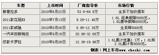 從上表我們可以看出,豐田的五款車集中上市在夏秋季節(jié),這也正是產(chǎn)品上市的最佳時(shí)期,老車型進(jìn)行清庫(kù),新車的更新?lián)Q代升級(jí),廠商指導(dǎo)價(jià)相對(duì)原來保持不變活略低一些。熱點(diǎn)車型市場(chǎng)波動(dòng)相對(duì)來說較小,維持一種穩(wěn)定的價(jià)格區(qū)間內(nèi),但非熱門車型波動(dòng)幅度稍微大了些,商家的變相促銷方式層出不窮,具體詳情請(qǐng)見下面的進(jìn)一步的分析: