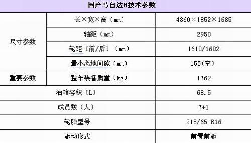資料顯示,國(guó)產(chǎn)馬自達(dá)8的車(chē)身尺寸為長(zhǎng)4860mm;寬1852mm;高1685mm,最多可以容納8人,遠(yuǎn)遠(yuǎn)超過(guò)B級(jí)轎車(chē)的2950mm軸距保證了足夠的后排空間。