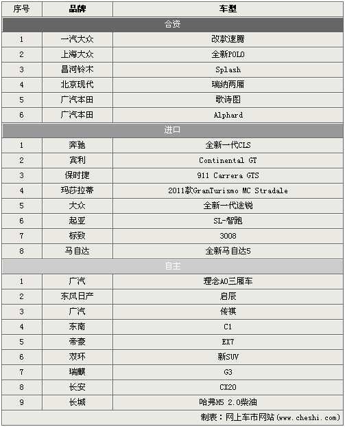 從表中可以看出,在2010年第四季度(10-12月)共有23款新車將于消費(fèi)者見面。合資品牌品牌共有6款車型登場,上海大眾的全新POLO和廣汽本田的歌詩圖是關(guān)注度相對(duì)高的兩款明星車型;進(jìn)口陣營中奔馳全新CLS已經(jīng)被炒得非;馃幔蹆r(jià)低很多的起亞SL-智跑則會(huì)引起共多SUV愛好者的注目;自主幫派以9款新車雄居榜首,第四季度這部分的特點(diǎn)在于有全新的品牌加入戰(zhàn)局,廣汽、東風(fēng)等合資品牌都將下一步的計(jì)劃投身到自主品牌的浪潮之中。