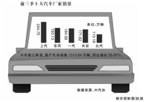 中國汽車工業(yè)協(xié)會昨日發(fā)布最新統(tǒng)計數(shù)據(jù)稱,今年前三季度,國產(chǎn)汽車產(chǎn)銷1308.27萬輛和1313.84萬輛,同比增長36.10%和35.97%,逼近去年全年水平。而全年銷量或?qū)⒊^美國歷史最高銷量,達(dá)到1700萬輛,并在2015年實現(xiàn)2500萬輛產(chǎn)能規(guī)模。