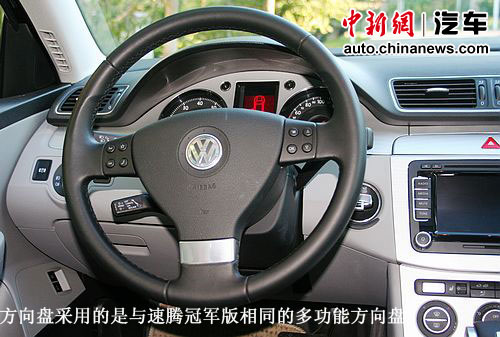方向盤還是沿用了大眾的三幅方向盤,外圈以真皮包裹手感還算過得去,方向盤兩側(cè)帶有多功能按鍵,可較為方便的對音響系統(tǒng)等進(jìn)行控制,但由于按鈕較小使用起來并不是很舒服,不過也許在用慣了的情況下還算好用。