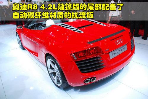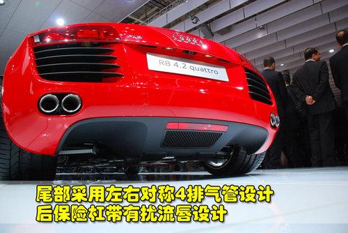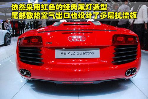奧迪R8 4.2L敞篷版的尾部配備了自動升級的碳纖維材質(zhì)擾流板,可以進一步減輕車身自重。這款新車的尾部依然采用紅色的經(jīng)典尾燈造型,而且尾部的散熱空氣出口也設(shè)計了多層擾流板。奧迪R8 4.2L敞篷版尾部采用左右對稱的4排氣管設(shè)計,后保險杠也采用了擾流唇的設(shè)計。