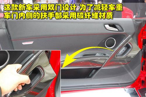 奧迪R8 4.2L敞篷版采用雙門開啟方式,為了減輕車重,車門內(nèi)側(cè)的扶手都采用碳纖維材質(zhì)打造。而且車門的內(nèi)襯大部分都采用真皮材質(zhì)包裹,質(zhì)地非常柔軟。車門內(nèi)側(cè)還設(shè)計了儲物空間,方便存放比較小的隨身物品。