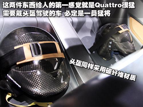 座椅后面是兩塊小型除霧空間,不過這里配備了兩個頭盔。沒錯,駕駛奧迪Quattro概念車是需要頭盔的,因為它是在太快太強,頭盔的面料同樣采用碳纖維設(shè)計。
