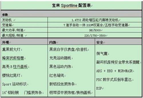 動力方面,寶來Sportline搭載1.4TSI發(fā)動機(jī),其最大輸出功率130PS/5000rpm,峰值扭矩220Nm/1750-3500rpm,在變速器方面,寶來Sportline有7擋DSG雙離合自動變速器和5擋手動變速器兩種選擇。