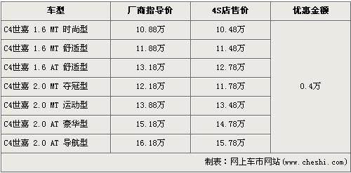 C4世嘉是東風(fēng)雪鐵龍于2008年7月28日發(fā)布的去年第二款新車,廠商指導(dǎo)價(jià)為10.88萬-16.88萬元。今年的4月6日,東風(fēng)雪鐵龍又為C4世嘉添加了2.0L手動(dòng)奪冠版車型,致使C4世嘉車型增加到了7款。近日根據(jù)網(wǎng)上車市價(jià)格監(jiān)測系統(tǒng)顯示,C4世嘉目前全系優(yōu)惠4000元,具體車型售價(jià)見下表: