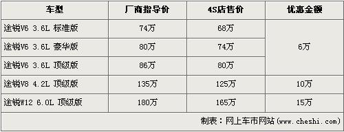 途銳是大眾首款引進(jìn)我國(guó)的SUV車(chē)型,在3.6L及4.2L率先上市后,大眾為了滿(mǎn)足消費(fèi)者的更大胃口,緊接著又推出了搭載12缸發(fā)動(dòng)機(jī)的6.0L車(chē)型。隨著大排量消費(fèi)稅的頒布,給9月份后入關(guān)的大排量車(chē)型帶來(lái)了一次不小的沖擊,令大排量汽車(chē)價(jià)格都上調(diào)了不少,大眾途銳6.0L頂級(jí)版也從原來(lái)158萬(wàn)元的價(jià)格上調(diào)至了180元。近日據(jù)網(wǎng)上車(chē)市價(jià)格數(shù)據(jù)監(jiān)測(cè)顯示,大眾途銳全系的最高優(yōu)惠達(dá)到了15萬(wàn)元,具體詳情請(qǐng)看下表:
