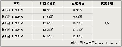 據(jù)4S店銷售人員介紹,新凱越分為1.6L與1.8L兩種排量車型,目前新凱越的1.6L全系優(yōu)惠2萬元,較上個月的優(yōu)惠降幅有所回縮。經(jīng)優(yōu)惠后,全系最低配的1.6LX-MT車型售價回升到了8.38萬元。經(jīng)優(yōu)惠后,1.8L手動和自動兩款車型售價也回升到了11.38萬元和12.98萬元。銷售人員還介紹,目前1.6L車型店內(nèi)無現(xiàn)車,欲購買者需交訂金2000元,下個月才可提車。