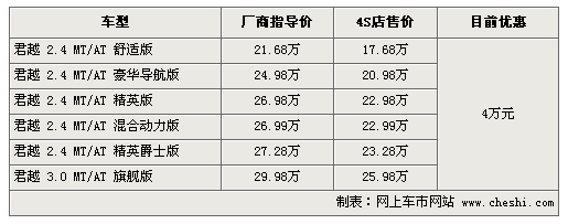 據(jù)4S店銷(xiāo)售人員介紹:由于新君越臨近上市,所以目前銷(xiāo)售的君越有大幅降價(jià),最高降幅達(dá)到4萬(wàn)元。目前除了混合動(dòng)力版需預(yù)定外,其他車(chē)型貨源充足,全系優(yōu)惠4萬(wàn)元;旌蟿(dòng)力版預(yù)訂需等一個(gè)月時(shí)間,訂金1萬(wàn)元。