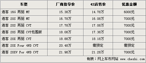 逍客是在國內上市的第一款真正意義上的跨界車,它同時也是日產(chǎn)歐洲設計中心成立之后開發(fā)的第一款新車,既擁有SUV的時尚外觀和越野性,又有轎車的舒適性和省油優(yōu)勢。根據(jù)網(wǎng)上車市價格監(jiān)測系統(tǒng)顯示,目前逍客全系最高優(yōu)惠7000元,具體車型以及價格如下: