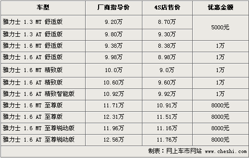 據(jù)4S店銷(xiāo)售人員介紹,目前雅力士全系車(chē)型有黑色、紫色等現(xiàn)車(chē)供應(yīng)。因?yàn)檐?chē)型較多,現(xiàn)車(chē)主要集中在1.3、1.6舒適版手動(dòng)和自動(dòng)擋車(chē)型上,其余高配車(chē)型均需要預(yù)訂。現(xiàn)金優(yōu)惠方面1.3排量?jī)煽钴?chē)可以?xún)?yōu)惠現(xiàn)金5000元,1.6精致版優(yōu)惠則達(dá)到了1萬(wàn)元,最低售價(jià)僅為8.38萬(wàn)元。至尊版車(chē)型優(yōu)惠8000元現(xiàn)金,如果消費(fèi)者到店的話(huà)還將有一部分的優(yōu)惠。