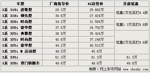 據(jù)4S店銷(xiāo)售人員介紹:目前寶馬3系全系車(chē)型都有一定幅度優(yōu)惠,最高降幅達(dá)到3.9萬(wàn)元。雖然較之前的優(yōu)惠幅度有所減小,但是目前現(xiàn)車(chē)比較多,尤其寶馬318i系列與325i系列店內(nèi)現(xiàn)車(chē)充足,320i豪華型需預(yù)定,預(yù)訂需等1個(gè)月至2個(gè)月時(shí)間。據(jù)經(jīng)銷(xiāo)商介紹,寶馬318i進(jìn)取型將近停產(chǎn),所以喜歡這款車(chē)的朋友盡快到店內(nèi)訂車(chē),目前店內(nèi)有少量現(xiàn)車(chē)顏色不全。在優(yōu)惠幅度上,寶馬318i系列在優(yōu)惠1萬(wàn)元后可打9.4折,寶馬320系列兩款車(chē)型在優(yōu)惠1.3萬(wàn)元后可打9.6折,325系列可優(yōu)惠2萬(wàn)后再打9.6折。寶馬335i和320i雙門(mén)轎跑車(chē)無(wú)任何優(yōu)惠,預(yù)定車(chē)需等4-6個(gè)月。