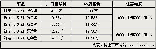 廣汽本田鋒范自上市以來(lái),以全新的造型得到了消費(fèi)者的極大關(guān)注,隨著同級(jí)別競(jìng)爭(zhēng)車型的不斷推出,鋒范在價(jià)格上也出現(xiàn)了松動(dòng),其中1.8L最高優(yōu)惠幅度達(dá)到了6000元,同時(shí)還有購(gòu)車送禮的活動(dòng)推出,具體行情如下: