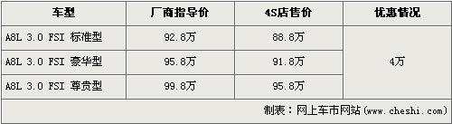 據(jù)北京奧迪經(jīng)銷店銷售人員介紹,目前奧迪A8L的3.0L車型有4萬(wàn)元的優(yōu)惠。經(jīng)優(yōu)惠后,3.0L標(biāo)準(zhǔn)型的售價(jià)從92.8萬(wàn)下降到了88.8萬(wàn)元,3.0L豪華型的售價(jià)從95.8萬(wàn)元下降到了91.8萬(wàn)元,3.0L尊貴型的售價(jià)也從99.8萬(wàn)元下降到了95.8萬(wàn)元。銷售人員還介紹,店內(nèi)目前沒(méi)有現(xiàn)車,欲購(gòu)買的消費(fèi)者需交2萬(wàn)元訂金,本月月底可提車。