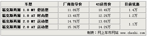 據(jù)4S店銷(xiāo)售人員介紹:目前福克斯兩廂1.8升兩款車(chē)型現(xiàn)車(chē)較充足,顏色齊全,手動(dòng)擋車(chē)型目前優(yōu)惠1.4萬(wàn)元,優(yōu)惠后僅為10.49萬(wàn)元,1.8升自動(dòng)版車(chē)型優(yōu)惠1.2萬(wàn)元,優(yōu)惠后價(jià)格售12.29萬(wàn)元。2.0升車(chē)型目前現(xiàn)車(chē)較少,顏色也不齊全,幾乎全部需要預(yù)訂,訂車(chē)需等待一個(gè)半月時(shí)間,目前優(yōu)惠1.1萬(wàn)元。由于2.0升車(chē)型銷(xiāo)量較少,所以廠家排產(chǎn)量也非常小,等待時(shí)間也較長(zhǎng)。如果您對(duì)動(dòng)力性要求十分高,推薦2.0升手動(dòng)版車(chē)型,如果您作為代步使用,建議購(gòu)買(mǎi)1.8升車(chē)型。