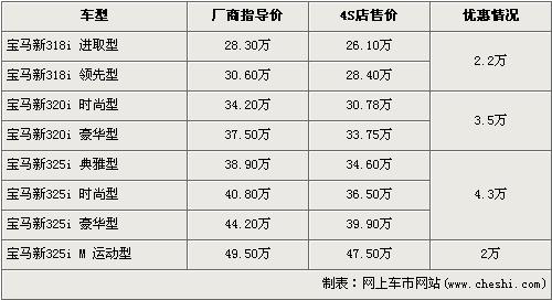 新寶馬3系在去年12月份正式在國內市場正式上市銷售,經過改款后的3系從外觀的流線,到內飾的風格均有一定程度的變化,帶給消費者的是全新的視覺沖擊和駕馭樂趣。根據(jù)網上車市價格監(jiān)測系統(tǒng)顯示,新寶馬3系車型全系出現(xiàn)了不同的現(xiàn)金優(yōu)惠,最高優(yōu)惠達到了4.3萬元,具體車型價格如下: