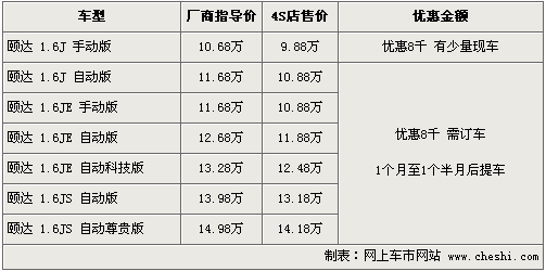 據(jù)東風日產(chǎn)4s店銷售人員介紹,目前頤達全系車型現(xiàn)金優(yōu)惠8千元。經(jīng)優(yōu)惠后,入門級的1.6J 手動版車型售價從10.68萬元下降到了9.88萬元,高配的1.6JS 自動尊貴型售價也下降到了14.18萬元。北京地區(qū)4S店目前只有個別1.6J時尚版車型,其他款車型無現(xiàn)車,欲購買者需交1000元訂金約等1個月至1個半月的時間。北京地區(qū)各4S店由于訂單不同,各店銷售的現(xiàn)車顏色有所不同。
