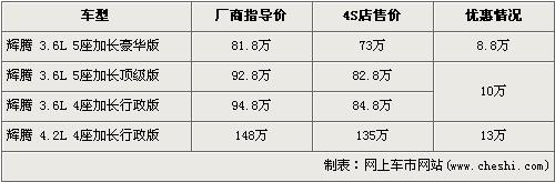輝騰是大眾旗下高端的豪華車型,其與奧迪的A8L出自大眾的同一平臺。今年的3月30日,搭載全新缸內(nèi)直噴的3.6L發(fā)動機(jī)的輝騰正式上市,3.6L的輝騰售價(jià)區(qū)間為79.25萬元-94.8萬元。隨著寶馬新730Li的上市,與其成為競爭對手的輝騰在價(jià)格上會有什么變化呢?據(jù)了解,輝騰近日出現(xiàn)了最高13萬元的優(yōu)惠,具體車型請看下表: