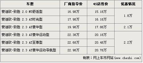 據(jù)4S店銷售人員介紹:在售的蒙迪歐-致勝共有6款車型,近期購買的消費(fèi)者最高可以得到2.2萬元的優(yōu)惠。入門級(jí)的2.0L手動(dòng)舒適版以及2.3L自動(dòng)時(shí)尚版經(jīng)1.8萬元的優(yōu)惠后,售價(jià)分別降為了15.18萬元和16.18萬元,2.3L自動(dòng)豪華版經(jīng)2.1萬元優(yōu)惠后,售價(jià)降到了2.1萬元。2.3L豪華運(yùn)動(dòng)版、至尊版以及豪華運(yùn)動(dòng)導(dǎo)航版經(jīng)全系最高的2.2萬元優(yōu)惠后,售價(jià)分別降為了20.18萬、20.48萬以及20.78萬元。