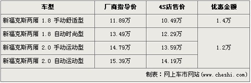 ?怂箲{借出色的外觀設(shè)計(jì)及極佳的操控性贏得了市場(chǎng)的認(rèn)可,在銷(xiāo)量方面一直保持迅猛的勢(shì)頭。尤其新款?怂沟纳鲜校桓膬(nèi)飾略顯粗糙的詬病,使得福克斯更趨于完美。?怂共捎昧宋譅栁諷40底盤(pán),將操控進(jìn)行到底,這一優(yōu)勢(shì)博得全世界的掌聲,名副其實(shí)成為了這個(gè)級(jí)別的標(biāo)桿車(chē)型。據(jù)網(wǎng)上車(chē)市價(jià)格系統(tǒng)檢測(cè)顯示,目前兩廂?怂谷底罡邇(yōu)惠1.4萬(wàn)元,具體車(chē)型價(jià)格請(qǐng)看下表: