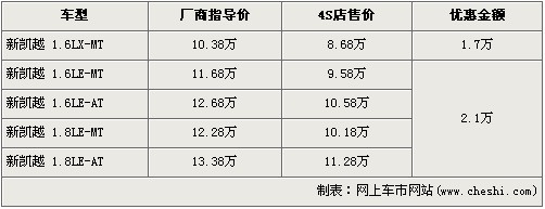 據(jù)4S店銷售人員介紹,新凱越分為1.6L與1.8L兩種排量車型,目前新凱越除了入門(mén)級(jí)的1.6LX-MT版優(yōu)惠1.7萬(wàn)外,其他車型均優(yōu)惠2.1萬(wàn)元。經(jīng)優(yōu)惠后,全系的最低價(jià)格降到了8.68萬(wàn)元。銷售人員還介紹,新凱越店內(nèi)現(xiàn)車比較充足,消費(fèi)者挑選的空間較大。
