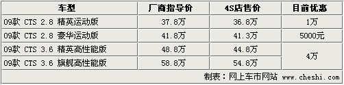 據(jù)4S店銷售人員介紹:目前在售的凱迪拉克09款CTS共有2.8L和3.6L兩個(gè)排量車型。這4款車型中,3.6升車型優(yōu)惠幅度較大,2款車可優(yōu)惠4萬元;而2.8升車型優(yōu)惠較少,豪華運(yùn)動(dòng)版僅優(yōu)惠5000元。目前3.6升車型為數(shù)不多,喜歡的朋友請(qǐng)盡快與店內(nèi)聯(lián)系。顏色方面,2.8升精英運(yùn)動(dòng)版車型有白色、銀色、金色,2.8升豪華運(yùn)動(dòng)版有紅色車型,3.6升車型有紅色、灰色車型。另外,年底或明年初將上市新款凱迪拉克CTS,并配備3.0升直噴發(fā)動(dòng)機(jī),對(duì)此車感興趣的朋友請(qǐng)隨時(shí)關(guān)注。