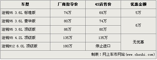 途銳是大眾首款引進(jìn)我國(guó)的SUV車型,在3.6L及4.2L率先上市后,大眾為了滿足消費(fèi)者的更大胃口,緊接著又推出了搭載12缸發(fā)動(dòng)機(jī)的6.0L車型。隨著大排量消費(fèi)稅的頒布,給9月份后入關(guān)的大排量車型帶來(lái)了一次不小的沖擊,令大排量汽車價(jià)格都上調(diào)了不少。近日據(jù)網(wǎng)上車市價(jià)格系統(tǒng)監(jiān)測(cè)顯示,大眾途銳的6.0L車型已經(jīng)停止進(jìn)口,并且購(gòu)買目前購(gòu)車可以得到最高6萬(wàn)元的優(yōu)惠,具體詳情請(qǐng)看下表: