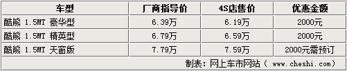 酷熊作為長(zhǎng)城汽車在市場(chǎng)上推出的第三款轎車產(chǎn)品,憑借極具個(gè)性的造型和寬大的內(nèi)部空間,使很多消費(fèi)者都對(duì)其非常感興趣。新車價(jià)格分別為豪華型6.39萬(wàn)元、精英型6.79萬(wàn)元,天窗版7.79萬(wàn)元。近日,網(wǎng)上車市網(wǎng)站了解到,長(zhǎng)城汽車4S店處的天窗版酷熊仍然處在無(wú)車銷售的狀態(tài),其他兩款車型有現(xiàn)車銷售,可以給出2千元的優(yōu)惠。具體詳情如下: