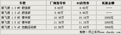 據(jù)廣汽本田4S店銷售人員介紹,飛度目前的優(yōu)惠一直保持在2000元-3000元,其中1.5運動版最高優(yōu)惠3000元,其他車型可優(yōu)惠現(xiàn)金2000元,F(xiàn)車方面1.3L現(xiàn)車較少,其它車型有現(xiàn)車供應(yīng),但部分型號顏色不全,仍需要預(yù)訂,訂金為1千元。
