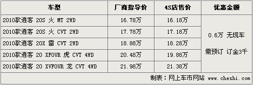 東風(fēng)日產(chǎn)旗下的2010款逍客于09年10月28日在全國(guó)正式上市,售價(jià)為16.78萬-21.98萬。新款逍客在原來車型基礎(chǔ)上對(duì)配置以及車型進(jìn)行了全面升級(jí)和優(yōu)化,為消費(fèi)者提供了最準(zhǔn)確的滿足市場(chǎng)需求的選購(gòu)空間。筆者近期了解到,日產(chǎn)今年內(nèi)將推出新款逍客車型,但詳細(xì)上市日期未公布,而現(xiàn)款逍客優(yōu)惠方面也有所增加,全系優(yōu)惠6000元。具體車型價(jià)格如下: