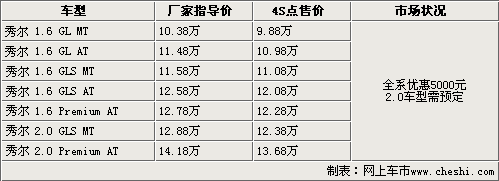 據(jù)東風(fēng)悅達(dá)起亞4S店銷(xiāo)售人員介紹:現(xiàn)在購(gòu)買(mǎi)起亞秀爾全系均可以得到5000元的現(xiàn)金優(yōu)惠。目前秀爾現(xiàn)車(chē)充足,顏色也比較齊全,現(xiàn)車(chē)顏色以白色、銀色、橙色、紅色為主。2.0車(chē)型需要預(yù)訂,需要繳納訂金5000元,一周左右可以提到現(xiàn)車(chē)。北京地區(qū)各4S店由于訂單不同,各店銷(xiāo)售的現(xiàn)車(chē)顏色有所不同,消費(fèi)者在購(gòu)買(mǎi)前可以多去幾家4S店。