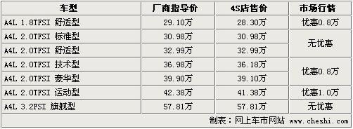 據北京一汽奧迪經銷店銷售人員介紹:目前A4L全系現車比較齊全,除1.8TFSI及3.2L車型現車較少以外,其余車款均有現車,F車顏色主要有銀色、灰色、紅色等,如預定其他顏色車型需預定,預定最少等20天,最長等待1個半月。1.8TFSI及3.2L車型等待時間較長,需等3個月時間。優(yōu)惠方面,目前全系最高優(yōu)惠1萬元,其余車型均有8000元左右的優(yōu)惠幅度,F購車取消了加價,并還有一定幅度的優(yōu)惠,此時購車比較劃算,喜歡的消費者請及時與店內聯(lián)系。