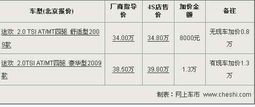 在途觀面前,Tiguan顯得有些復(fù)雜。進(jìn)口大眾官方自Tiguan上市以來(lái)共推出2款車型,分別為舒適版與豪華版。Tiguan舒適版指導(dǎo)價(jià)為34萬(wàn),豪華版指導(dǎo)價(jià)為38.5萬(wàn)。但在北京各4S店處,售價(jià)均上漲為34.8萬(wàn)、39.8萬(wàn),兩款車分別比指導(dǎo)價(jià)高出8000元-13000元不等。Tiguan舒適版目前各店均無(wú)現(xiàn)車銷售,如預(yù)訂最快需等到4月底;而豪華版車型4S店有少量現(xiàn)車,且最高可在39.8萬(wàn)元的基礎(chǔ)上優(yōu)惠1萬(wàn)元,最低售價(jià)38.8萬(wàn)元。顏色不是非常齊全,各店現(xiàn)車情況有所不同。